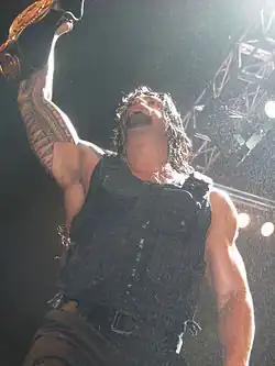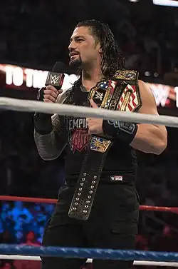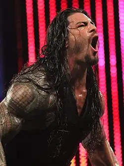 At Money in the Bank on June 14, Reigns competed in his first Money in the Bank ladder match, but lost after Bray Wyatt interfered and attacked him.[100] Reigns lost to Wyatt on July 17 at Battleground after interference from Luke Harper.[101] He enlisted the help of Ambrose in order to take on the reformed Wyatt Family, defeating Wyatt and Harper at SummerSlam on August 23.[102][103] The following night on Raw, Reigns and Ambrose were attacked by Wyatt's new ally, the debuting Braun Strowman.[104] On September 20, at Night of Champions, Reigns, Ambrose and Chris Jericho were defeated by Wyatt, Harper and Strowman.[105] The feud between Reigns and Wyatt ended in a Hell in a Cell match at the titular event on October 25, which Reigns won.[106]