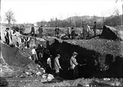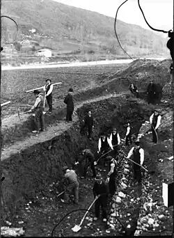 Throughout the rest of the 19th century, archaeological objects continued to be found sporadically, but without an excavation campaign being organised.[8] It was only at the end of the century, in the years 1890–91, that new excavations were entrusted to Albert Lebèque, an archaeologist, pupil of Emile Burnouf and trained at the French School of Athens. He then became professor of Greco-Roman antiquities at the University of Toulouse. After the scandals involving Du Mège about the commerce of falsified antiques, the aim of Lebèque's excavation campaign was to "dispel doubts" about the conduct of previous investigations, given the lack of confidence of the scientific community.[14] The excavations confirmed the disruption of the site and the authenticity of the artefacts found by Du Mège, although in the end Lebègue mistrusted Du Mège's findings. Lebègue's death in 1894 put an end to the work.