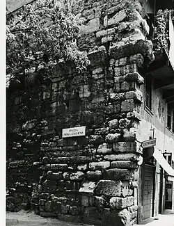 Of the curtain walls that encircled the built-up area of Roman Verona few visible traces remain, although their layout is still very evident today as the historic fabric grew and developed by leaning against and reusing surviving portions of the walls. Of the late republican walls, in particular, only two sections of brick wall have been found, discovered between the Adige and Porta Borsari and in Via Leoncino, while more conspicuous remains of the imperial walls have been preserved, mainly in Piazza Mura di Gallieno.[29] Of the curtain wall erected by Theodoric, on the other hand, conspicuous ruins remain visible in Via Diaz, in the alleys San Matteo and del Guasto, and in Via San Cosimo, Via Leoncino and Via Amanti.[9]