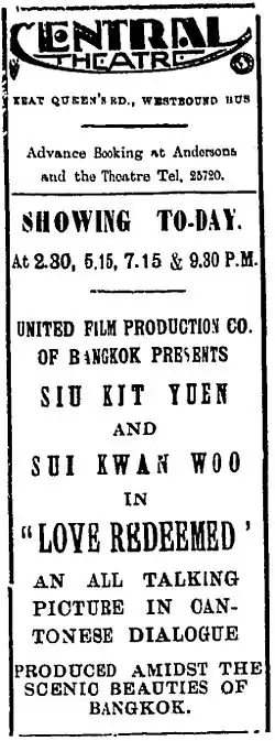 Romance in Mekong River (also known as "Honor Redeemed" or "Love Redeemed" in Hong Kong; Chinese: 湄江情浪) is a 1933, 2 hours romance musical film made by a group of Chinese overseas in Bangkok formed Siam United Film Studio, Thailand, directed by a USA Hollywood director with Western Electric Company's Movietone sound system in Cantonese dialect.[1] The film premiered in Thailand cinemas on 10 October 1933,[2] in Hong Kong cinemas on 17 December 1933,[1] and in Singapore cinemas on 8 December 1934.[3]