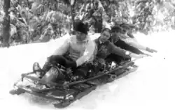 The practice of bobsleigh in Romania dates back to around 1909,[2] when sporting activity was limited to a few days a year, around the winter holidays; from 1910 "winter sports competitions" were organised, with modest participation. Until 1916, bobsleigh races were regularly held in Sinaia, along with sledging and skeleton races, but without precise rules. The first winner of a bobsleigh race in 1910 was N. Filiti, and the first winner of a multi-team race was a generic "Romanian Sports Club" (Cercul Sportiv Român). In 1911, the presence of women in bobsleighing was very active: competitions were organised in three events (two-woman bobsleigh, two-man bobsleigh and team competition of 2-5-6 persons), whose winners included Natalia Darvari (women), Jean Costinescu (men) and the mixed crew of the "Societatea Săniutza". In 1912, the competition programme was the same: in the women's category Mihaela Ghyka won, and in the men's category a (male) crew led by Mihaela Ghyka herself won.[3]