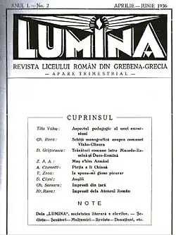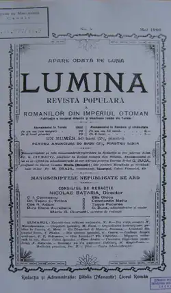 The high school in Bitola became a gathering point for the Aromanian intellectuals who published multiple Aromanian publications (magazines, newspapers, almanacs) at the end of the 19th century and the beginning of the 20th, in which they campaigned for the cultivation of writing in the Aromanian language.[32] In particular, the magazine Lumina ("The Light"), the first Aromanian magazine published in the Ottoman Empire, appeared in January 1903 at the initiative of a group of teachers from the high school headed by Aromanian cultural activist, statesman and writer Nicolae Constantin Batzaria. The magazine featured much content of educational and didactic, but also political and national nature.[33] Most of the articles were written in Romanian, and only a part in Aromanian.[34] Published monthly by the House of the Romanian Didactic and Ecclesiastical Corps of the Ottoman Empire,[35] Lumina was the magazine of the high school as stated by Romanian Aromanian editor, literary critic and writer Hristu Cândroveanu.[36] It featured contributions from multiple notable intellectuals, including Zicu Araia, Batzaria himself,[37] Leon Boga (in which he debuted as poet),[36] Constantin Belimace, Theodor Capidan,[38] George Ceara[39] and George Murnu.[38] Lumina was published until 1908.[35]