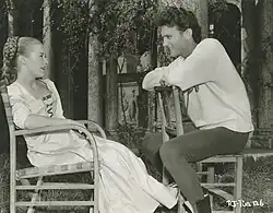 Joan Collins was originally announced to play Juliet,[3] but was replaced by Susan Shentall. A well-known stage Romeo, John Gielgud, played Castellani's chorus (and would reprise the role in the 1978 BBC Shakespeare version). Laurence Harvey, as Romeo, was already an experienced screen actor, who would shortly take over roles intended for the late James Dean in Walk on the Wild Side and Summer and Smoke.[4] By contrast, Susan Shentall, as Juliet, was a secretarial student who was discovered by the director in a London pub, and was cast for her "pale sweet skin and honey-blonde hair."[5] She surpassed the demands of the role, but married shortly after the shoot, and never returned to the screen.[5][6]