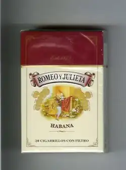 Romeo y Julieta, originally famous for its premium Cuban cigars, expanded production to include cigarettes in 1999.[2] Manufactured by Habanos S.A. and BrasCuba, the brand is owned by Altadis, a subsidiary of Imperial Tobacco.[3] What makes these cigarettes distinctive is that they are made from the same high-quality dark tobacco as Romeo y Julieta cigars, giving them a very rich and strong flavor, similar to other robust brands like Gauloises.[4][5] Romeo y Julieta cigarettes are mainly sold in Cuba, but are or were sold in Spain, Germany, Austria, Switzerland, Mexico Moldova and Russia.[6][7] Made of the same tobacco as their older cigar namesakes, Romeo y Julieta cigarettes are notable for their very strong flavour. They are made of dark tobacco, like gauloises.