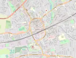 There was early expansion of 200 cottages in the 1840s in an area known as New Romford that was formerly occupied by an army barracks.[6] To the east of the market place from 1850 middle class suburban housing was constructed with a much larger area of 200 acres (80 hectares) built-over to the south of the railway from 1851 and by 1861 the population had grown to 3790.[18] Through a gradual process of selling off former manors, houses were built radiating from the town in all directions for about a mile, and further significant growth occurred between 1910 and 1911 with the construction of Romford Garden Suburb, which included Raphael Park and Gidea Park railway station.[6] Large sections of land to the north of the town at Collier Row were developed in the interwar period and after World War II, the London County Council built the Harold Hill estate to the north east from 1948 to 1958.[6] The Barrack Ground estate was redeveloped in the early 1960s and the name Waterloo Road estate was applied.[19]