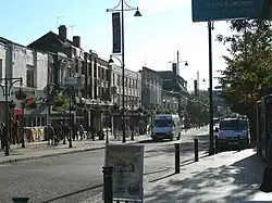 The town centre is about 50 feet (15 m) above sea level on a gravel terrace rising from the River Thames.[6] The north of the town has developed on London Clay and is situated as much as 150 ft (46 m) above sea level. A continuous gentle rise in the eastern suburbs towards Gidea Park and Harold Wood peaks around 177 feet (54 m) around the Harold Court. On the northern side, Harold Hill peaks at 75 m (246 ft). The semi-rural area north of Collier Row and Harold Hill consists of many rolls of hills, with elevation peaking at the village of Havering-atte-Bower, 344 feet (105 m). The town centre is for the most part contained within a ring road formed of St Edwards Way, Mercury Gardens, Thurloe Gardens, Oldchurch Road and Waterloo Road. The market place and much of South Street and the High Street are pedestrianised.[26] The railway cuts through the town from east to west on a viaduct, with the bulk of the central Romford area to its north. The River Rom flows through the town in underground channels and joins the Thames after flowing through Hornchurch;[6] elsewhere along its course it is known as the River Beam[3] and forms part of the strategic waterways Blue Ribbon Network.[27]
