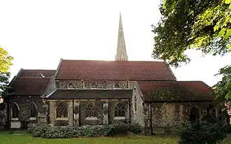 The town developed in the Middle Ages on the main road to London and the regionally significant Romford Market was established in 1247.[4] The original site of the town was to the south, in an area known as Oldchurch. It was moved northwards to the present site in the later medieval period to avoid the frequent flooding of the River Rom. The first permanent church on the site of the current Church of St Edward the Confessor was built after permission was granted by Henry IV in 1406.[5] The early history of Romford and the immediate area is agricultural and it is recorded as being the location of a number of mills used to grind corn.[4] The area was a focus of the leather industry from the 15th to the early 19th centuries and there is record of a wide range of industries such as cloth making, weaving, charcoal burning, metal working and brewing.[4] Communications played an important part in its development; the main road to London was maintained by the Middlesex and Essex Turnpike Trust from 1721 and Romford became a coaching town in the 18th century.[6]