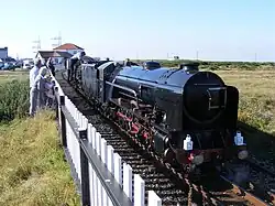 Howey was not satisfied with just 8+1⁄4 miles (13.3 km) of track from Hythe to New Romney and plans were in hand for an extension even before the original section had opened. The line was to be extended 5+1⁄2 miles (9 km) from New Romney to Dungeness, double-tracked throughout apart from a balloon loop on which the station at Dungeness was sited. A Light Railway Order for this extension was applied for and, following a Public Inquiry on 18 April 1928, the Romney, Hythe & Dymchurch Light Railway (Extension) Order was granted on 12 July 1928. Ahead of this the line between New Romney and The Pilot had actually opened on 24 May 1928 and the rest of the line through to Dungeness opened on 3 August 1928.[8] Since it was laid directly onto the shingle forming the Dungeness peninsula it has been suggested that the extension was the most cheaply constructed railway in the world.[9]
