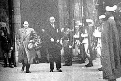In 1942 de Toledo was confirmed as member of the Francoist elite when re-appointed on position 46[132] to III Consejo Nacional.[133] When during first major redressing the system a quasi-parliament Cortes Españolas was set up, in 1943 by virtue of membership in Consejo de Toledo automatically became its member.[134] This sequence of appointments continued; in 1946 he was nominated to IV. Consejo Nacional (position 22)[135] which triggered nomination to the II. Cortes,[136] while the 1949 nomination (position 21)[137] guaranteed his seat in the III. Cortes.[138] Throughout all these years he remained Director General de Primera Enseñanza and one of the most influential people shaping the education system. His term came to the end after 12 years, when in 1951 Ibáñez Martín ceased as minister of education and was replaced by Joaquín Ruiz-Giménez Cortés. It is not clear whether de Toledo was forced to resign or whether he decided to go himself; following a solemn farewell ceremony, he left the ministry in July 1951.[139]