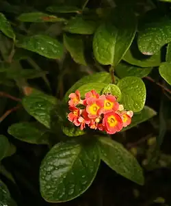 This plant is a shrub[2] or small tree[1] growing up to 2 meters tall. The rough, leathery leaves are oppositely arranged and measure up to 5 centimeters long. The inflorescence is a cluster of several five-lobed flowers in shades of bright red with yellow throats.[2]
