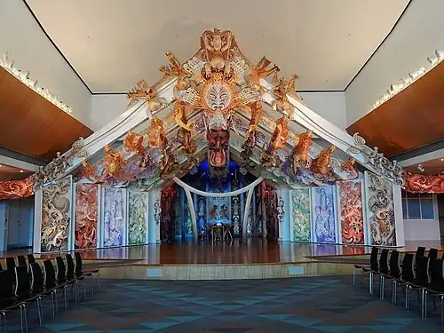 The design, described as "postmodern",[4] was overseen by Te Papa's inaugural kaihautu (Māori leader), master carver Cliff Whiting.[5] As "the only one of its kind expressly built for that purpose in a museum",[6] this marae is "arguably the most prominent embodiment of [Te Papa's] commitment to biculturalism".[7]