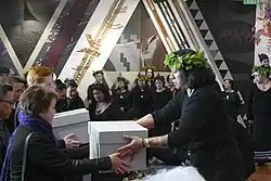 Rongomaraeroa is used for many events, not only as a museum exhibit – it was always intended to be a "'living marae' used for pōwhiri, functions, and tangi".[7] For example, in May 2017 and July 2018 the marae was the site of ceremonies of repatriation of Māori and Moriori remains – including toi moko – from several European and American institutions.[8][9][10] Rongomaraeroa is unique in its ability to serve as the location for such ceremonies as it is a "nationalised, pan-iwi marae".[11] As traditional gathering spaces, marae are always located on the ground. However, given the situation of this one on an upper level of the building, Whiting nicknamed Rongomaraeroa "the marae in the sky".[7] The name also helped to differentiate it as a marae belonging to the museum "with its own special Te Papa kawa [protocols]", and not to Te Āti Awa – the local iwi [tribe] of the Wellington area.[7] Although initially controversial and charged with being a "reappropriation" of complex Māori practices and protocols "...to serve its reconciliatory, bicultural remit, often at the expense of more contested issues such as Māori self-determination...",[4] it is now widely accepted as a genuine marae, "by intention if not by inheritance".[6] Rongomaraeroa is also available for hire from Te Papa for commercial and private events.[12]