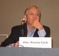 Ronald Dale Earle (February 23, 1942 – April 5, 2020) was an American politician and judge who was, from January 1977 to January 2009, the District Attorney for Travis County, Texas. He became nationally known for filing charges against House majority leader Tom DeLay in September 2005 for conspiring to violate Texas' election law and/or to launder money. In Texas, Earle was known for his criminal justice reform efforts which focused on crime prevention, alternative sentencing, victim advocacy, and the reintegration of former offenders into society. In 1983, Earle – an Eagle Scout – prosecuted himself for an election law violation after missing a campaign finance filing deadline by one day; he was fined $212.[1] Earle was a fixture in Travis County politics and served in public office there for more than 30 years, joking that he was asked if he was the "District Eternity".[2]