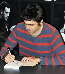 O'Sullivan has written three crime novels in collaboration with author Emlyn Rees:[93] Framed (2016),[94] Double Kiss (2017),[95] and The Break (2018). Although the novels are not autobiographical, they are loosely based on his early experiences and family life.[94] He has also written two autobiographies. His first, Ronnie: The Autobiography of Ronnie O'Sullivan, was published in 2003; and his second, Running: The Autobiography, was published in 2013.[96] He has also co-authored a health and fitness book with nutritionist Rhiannon Lambert entitled Top of Your Game: Eating for Mind and Body. Published in 2019, it contains healthy recipes and advice for "living better, eating healthier and feeding your brain to enhance your performance".[97]