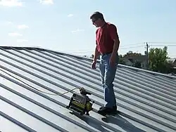 In 1976, a German immigrant and inventor, Ewald Stellrecht,[1] helped develop an early version of a metal roof panel portable roll forming machine in Exton, PA. From this a version of the roof seamer was also created. Since that time, great strides and innovations have been made in the development of roof seaming machines. Also, in the 1970s, Butler Manufacturing developed and released a proprietary roof system that featured the use of an electric roof seamer, dubbed the Roof Runner®, along with hand tools and an operating platform.[2] Many developments have been made since that time to make roof seamers lighter, faster, and more user-friendly. In 1989, Developmental Industries refocused the niche market by developing a line of roof seamers that were universal to many different panel manufacturers' products and were available to rent by the end-user.[3] Traditionally, purchasing a roof seamer meant that it would work with one specific roof panel, manufactured by a specific roof panel manufacturer. By opening up builders and installers to the option of renting, this allowed them to have the option of buying from different sources and greatly reducing their cost, making metal roofing a more accessible option for many that would not consider it before.