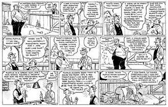 - Knock-offs, such as Associated Press' Mister Gilfeather (which, by the way, was handled at various times by both Al Capp and Milton Caniff, before they hit it big with Li'l Abner and Terry and the Pirates, respectively), began to proliferate. In fact, it was a knock-off that took Ahern away from his creation. King Features launched one called Room and Board, starring the very Hoople-like Judge Puffle, in 1936, and hired Ahern himself to write and draw it. This was a reprise of a move King had made nine years earlier, hiring George Swanson (Elza Poppin) to produce a duplicate of his own NEA strip, Salesman Sam, and it had a similar result — success, but not to the extent of the original. When, in 1953, Ahern retired, Room and Board ended. Today, its memory is overshadowed by its own topper, The Squirrel Cage, where the enigmatically familiar phrase, "Nov shmoz ka pop?" was introduced.[6]