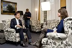 ![]() Moggré (right) interviewing Mark Rutte in 2010 | |