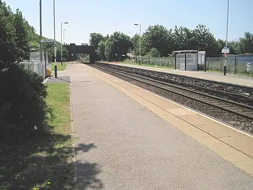 Facilities here are very basic. The station is unstaffed and there are no permanent buildings present, other than standard shelters.[1] A ticket vending machine is available on platform 1 for purchase of tickets or promise to pay coupons and for the collection of pre-paid tickets.[2] As of today train running information is provided by digital display, telephone and timetable posters. Step-free access to the platforms is available via a ramp on the south side from the nearby road bridge that also acts as the link between the two and directly from the adjacent road on the northbound side.[3][1]