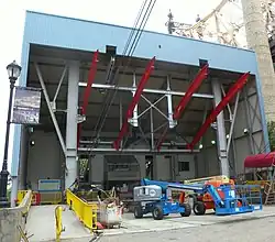 In the early 2010s, the Cornell Tech educational campus was planned on Roosevelt Island, and there were concerns that the tram and subway could not carry additional persons heading there.[177] In 2016, engineering company GC Eng & Associates was hired to renovate the Manhattan terminal.[178] Repairs to both terminals' platforms began in July 2017, during which one cabin was taken out of service at all times.[179] Headways were increased to 15 minutes,[180] which created severe overcrowding during rush hours.[181] One of the cabins' gearboxes was also rebuilt in 2018.[182] The platform reconstruction project was finished in February 2019, at which point RIOC was in the process of installing two elevators at the Manhattan terminal to replace the original elevator.[183]