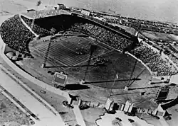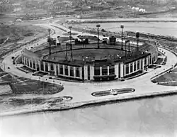 The stadium was envisioned as a Works Progress Administration (WPA) project on the grounds of what was the Jersey City Airport at Droyer's Point. The airport was built and first operated by noted aviator Clarence D. Chamberlin in 1928 and then later operated by aviator Eddie August Schneider starting in 1935.[3][4] By 1935, Jersey City was suffering from the effects of the Great Depression and Mayor Hague was looking to create construction jobs for Hudson County's working class. He applied for federal funds through the Civil Works Administration and the WPA of President Franklin D. Roosevelt's New Deal program. Under the terms of the grant program, the money received could not be used to purchase land so the city had to contribute land for the project. According to the Mayor, Droyers Point was the only available city-owned property and better suited for a municipal sports stadium than a municipal airport which would have eventually been a financial liability to the city. He boasted that the stadium would be a self-sufficient operation and would employ 250 people on a seasonal basis.[5][6]