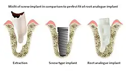 The basic principle of endosseous implants is a biological process described as osseointegration, in which materials such as titanium or ceramic form an intimate bond to bone.[3][4] There are no particular differences between the osseointegration of a root analogue implant and a conventional screw type implant.