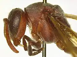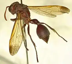 Ropalidia mabawa is an African species of paper wasp, described in 2025,[1] based on a single collected specimen. It represents a special lineage in the African members of this genus, with several unique characteristics. These include apically darkened wing, entirely reddish body, short mesosoma, elongated T1, shallow punctures and striate propodeum. The general appearance resembles another Polistinae genus, Belonogaster. However, the general resemblances with Belonogaster is a case of homoplasy, since second tergum and sternum are completely merged, which is a feature of the genus Ropalidia.