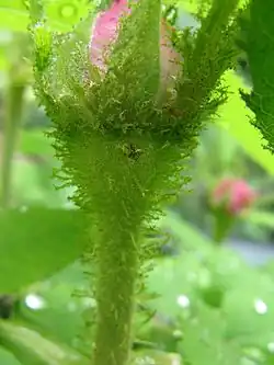 The original plant was sterile, but a sport with single flowers appeared in 1769, from which various cultivars known as centifolia roses were developed, many of which are further hybrids.[1] Other cultivars have appeared as further sports from these roses. Rosa × centifolia 'Muscosa' is a sport with a thick covering of resinous hairs on the flower buds, from which most (but not all) "moss roses" are derived. Dwarf or miniature sports have been known for almost as long as the larger forms, including a miniature moss rose 'Moss de Meaux'.