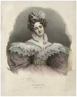 Caradori-Allan was born at the Casa Palatina, Milan, in 1800. Her father, Baron de Munck, was an Alsatian, who served in the French army, while her mother, whose maiden name was Caradori, was a native of Saint Petersburg.[1] According to the New American Cyclopedia, and Moore's Complete Encyclopaedia of Music, her father died when she was 20, leaving the family short of funds, and obliging her to employ professionally her musical talents, which had previously been under the direction of her mother, as "an elegant accomplishment". She must have had a good education as she developed into a versatile polyglot, proficient in English, French, German and Italian.[2]