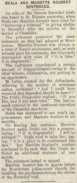 Soubère was referred to criminal court for having sheltered Ravachol at her home.[38] She was convicted for the first time during this third consecutive trial, this time for having harbored Ravachol.[37] After this conviction, she exclaimed:[37]