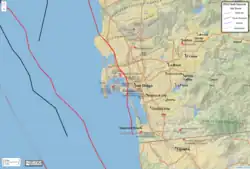 ![]() The Rose Canyon Fault is located at the bottom right of the map | |