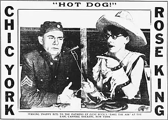 Most of Rose King's theatrical career was in partnership with B. M. "Chick" York. Their most famous and durable vaudeville act was "The Old Family Tintype". The team dated its inception at 1907 (in a 1937 radio interview they were "celebrating 30 years in show business"),[3] although their relationship dated from early childhood. Billboard Magazine published an old photo of York and King posing together, at the ages of five and three, respectively.[4]