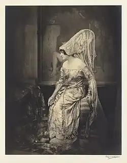 She was introduced to Norman Lindsay in 1902 by Julian Rossi Ashton, and began modeling for Lindsay that same year.[1][3] She became his principal model and later his lover, and after his marriage ended she joined him in London in 1910.[1] She was Lindsay's business manager and most recognizable model, as well as being the printer for most of his etchings.[3] In 1913 a pen-and-ink drawing she had posed for called Crucified Venus was shown at the Society of Artists' exhibition in Melbourne, but the Melbourne committee removed it from public view due to scandal over its eroticism.[1][4] However, Julian Rossi Ashton, who was the president of the Society of Artists, said he would withdraw all the New South Wales paintings from the exhibit unless Crucified Venus was shown again, and it was put back up within the week.[1] Rose also modeled for Julian Rossi Ashton, Harold Cazneaux, Sydney Long, Dattilo Rubbo, and Sydney Ure Smith.[1] In 1926 Rayner Hoff sculpted a statue of her.[1] Pictures of her are in Australia's National Portrait Gallery.[5]