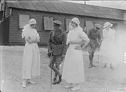 With the outbreak of the First World War, Rosemary's life changed. Her mother went to Belgium in early August 1914, having organised her own ambulance unit, but was captured by the Germans when Namur was occupied towards the end of that month. Due to her connections with both the British and German royal families, the Duchess and her staff were repatriated via Holland. After a short rest, the Duchess returned to northern France to reinstate her unit. Rosemary went with her as a Voluntary Aid Detachment (VAD) nurse.[2] After spending most of 1915 in France, she returned to the United Kingdom for rest and to help with fundraising efforts in November 1915.[3][4] Upon her return to France in 1916, Rosemary's reputation as a nurse increased, and when she returned to the United Kingdom in December, it was commented that she had delayed her leave as "they [the hospital surgeons] couldn't do without her".[5] Her war work was officially recognised with a mention in dispatches in January 1917.[6] Although she continued to serve in France during 1917 and 1918, she spent time in 1918 in the United Kingdom on fundraising efforts.[7] At the end of the war, Rosemary was awarded an Associate Royal Red Cross (ARRC) in the 1919 Birthday Honours.[8]