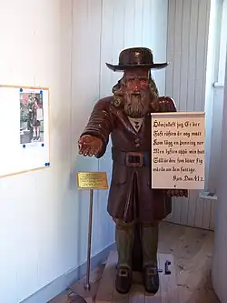 In front of the Karlskrona Admiralty Church, in Sweden, the popular wooden figure of Gubben Rosenbom (Old Man Rosenbom) has been standing since the mid 18th century. In 1956 the original was replaced by a copy and put in a safer place inside the church. The life-size figure is actually a poor box, which means, if you lift its hat, you can insert a coin for the poor.