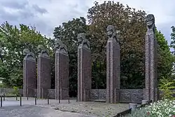 The Lion Gate stands at the main entrance to the Rosenhöhe, consisting of six clinker brick pillars designed by Albin Müller, on which are six lion sculptures by Bernhard Hoetger dating from 1914. The gates between the pillars have relief panels made in 1967 by the local artist Hermann Tomada, replicas of work by Hoetger. The Lion Gate was originally created as the main portal of the 4th Darmstadt Artists' Colony Exhibition of 1914 on the Mathildenhöhe, where the cast concrete lions stood on cast-stone double columns with Ionic capitals. After the exhibition, the gate was dismantled and stored. In 1927, Grand Duke Ernest Louis had it put up where it stands now. The lions are sometimes called the "sneezing hedgehogs".[2]
