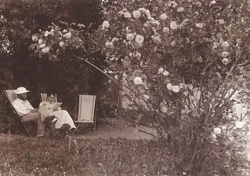 Roses (Danish: Roser) is an 1893 painting by P. S. Krøyer, one of the most successful artists of the community known as the Skagen Painters which flourished in Skagen in the north of Jutland in the late 19th century. The work shows Marie Krøyer, the artist's wife, seated in a deckchair under a large rose bush in the garden of a house they rented in Skagen, with their dog Rap asleep beside her.