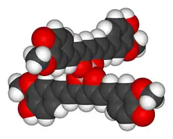 Rosocyanine is formed as a 2:1 complex from curcumin and boric acid in acidic solutions. The boron complexes formed with rosocyanine are dioxaborines (here a 1,3,2-dioxaborine). Curcumin possesses a 1,3-diketone structure and can therefore be considered as a chelating agent. Unlike the simpler 1,3-diketone–containing compound acetylacetone (which forms acetylacetonate complexes with metals), the entire skeleton of curcumin is in resonance with the 1,3-dicarbonyl section, making the backbone an extended conjugated system. Investigations of the structure have shown that the positive charge is distributed throughout the molecule. In rosocyanine, the two curcumin moieties are not coplanar but rather perpendicular relative to one another (as seen in the 3D model), as a result of the tetrahedral geometry of tetracoordinate boron. The same applies to rubrocurcumin.