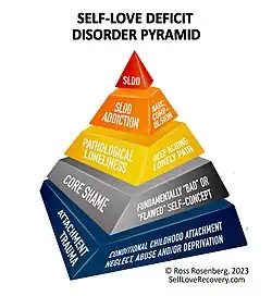 Rosenberg’s Self-Love Deficit Disorder/SLDD (codependency) Pyramid, also referred to as a developmental model of 'renamed codependency,' outlines the origins and progression of SLDD across five hierarchical levels:[21][22][18][19][20]