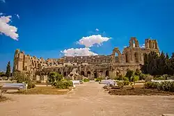 The invaders' route is unknown, as is the location of the battle or the "areas affected by the Razzia".[10] The invaders succeeded in taking the fortress of El Djem. The Byzantines paid tribute (2,500,000 dinars according to al-Athîr) to obtain the departure of the Arab troops, who took "a fabulous booty, witness to the immense wealth accumulated in the province".[15] The expedition lasted "nearly fifteen months", with raids in the Gafsa region and northwest of Sbeïtla, then a renewed offensive against the Byzantine troops, whose populations were driven by "panic and panic".[15] The amphitheatre of El Jem[15] had been used as a defensive site, as evidenced by the ground-floor arcades "carefully sealed", and as a shelter for the "remnants of the Byzantine army and [ other ] fugitives" before whom the invaders laid siege. The Arabs, who had to cope with logistical problems such as water supply,[16] were able to rely on the nearby Rougga cisterns, which could hold 7,600 m3.[17]