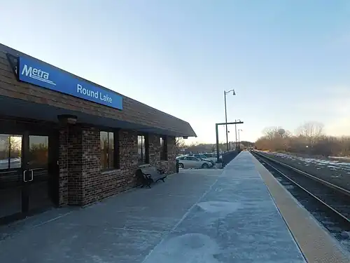 Round Lake is a commuter railroad station on Metra's Milwaukee District North Line in Round Lake, Illinois. The station is located at IL 134 and Cedar Lake Road, is 44.2 miles (71.1 km) away from Chicago Union Station, the southern terminus of the line,[2] and serves commuters between Union Station and Fox Lake, Illinois. In Metra's zone-based fare system, Round Lake is in zone 4. As of 2018, Round Lake is the 121st busiest of Metra's 236 non-downtown stations, with an average of 395 weekday boardings.[1]