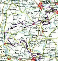 The founding section of the Route of Megalithic Culture runs through the territories of Osnabrück, Ostercappeln, Belm-Vehrte, Wallenhorst, Bramsche, Ankum, Berge, Bippen, Fürstenau, Freren, Thuine, Lingen (Ems), Meppen, Sögel, Werlte, Lastrup, Cloppenburg, Visbek, Großenkneten, Wildeshausen, Dötlingen, Ganderkesee and Oldenburg.[10]