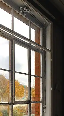 The company was initially listed in the Saxony/Thuringia manufacturers' address book in 1893 as a draw curtain furnishing factory.[3] And no later than 1896, with the patent for a ventilation window closure,[4][5] Rowac not only quickly acquired a satisfied customer base, but also asserted itself alongside its competitors. In 1898, the German Construction Newspaper (Deutsche Bauzeitung) had a resoundingly positive opinion of the ventilation window closure, as the mechanisms in use up to that time could not be recommended due to their major shortcomings. The so-called "Wagner'sche Verschluss" was particularly suitable for opening large and heavy overhead windows, such as those found in very high rooms, such as churches, concert halls, hospital halls, riding halls and gymnasiums. The advantage of the mechanism was an effortless opening and closing of the overhead windows of any width by simply pulling a chain connected to a semi-circular cogwheel mounted in the center of the overhead windows. Apart from these advantages, the initial cost was even lower than that of other designs for the same purpose. In Dresden, Wagner's ventilation window closures were installed in, among other places, the Residence Palace, the Imperial Palace, railroad station buildings and the district school in the neighborhood of Striesen.[6]