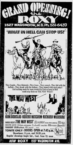 The Roxy, billed as "Miami Beach's newest and most fabulous theatre," opened on Friday, July 21, 1967.[3] For its grand opening, the theater premiered The Way West, starring Kirk Douglas, Robert Mitchum, and Richard Widmark.
