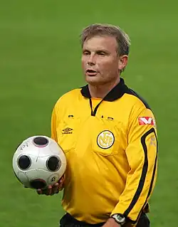 Roy Helge Olsen (born 19 January 1965) is a Norwegian football referee from Trondheim, representing Flekkerøy IL from Kristiansand. He started as a referee in 1979 and was a referee in FIFA from 1992 to 2002.[1] Olsen officiated in 2002 World Cup qualifying, refereeing the match between Spain and Bosnia.[2] He has refereed over 30 national matches at different age groups, both men and women, in addition to 28 matches in the European Cup. In 1991, he refereed the Norwegian Cup Final between Strømsgodset and Rosenborg, as well as the Norwegian Cup Final between Vålerenga and Strømsgodset in 1997. He also refereed the European Championship for U-18 in England in 1993.