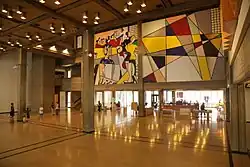 In 1964, Lichtenstein became the first American to exhibit at the Tate Gallery, London, on the occasion of the show "'54–'64: Painting and Sculpture of a Decade." In 1967, his first museum retrospective exhibition was held at the Pasadena Art Museum in California. The same year, his first solo exhibition in Europe was held at museums in Amsterdam, London, Bern and Hannover.[69] Lichtenstein later participated in documentas IV (1968) and VI in (1977). Lichtenstein had his first retrospective at the Guggenheim Museum in 1969, organized by Diane Waldman. The Guggenheim presented a second Lichtenstein retrospective in 1994.[54] Lichtenstein became the first living artist to have a solo drawing exhibitions at the Museum of Modern Art from March – June 1987.[80] Recent retrospective surveys include the 2003 "All About Art", Louisiana Museum of Modern Art, in Denmark (which traveled on to the Hayward Gallery, London, Museo Reina Sofia, Madrid,[81] and the San Francisco Museum of Modern Art, until 2005); and "Classic of the New", Kunsthaus Bregenz (2005), "Roy Lichtenstein: Meditations on Art" Museo Triennale, Milan (2010, traveled to the Museum Ludwig, Cologne). In late 2010 The Morgan Library & Museum showed Roy Lichtenstein: The Black-and-White Drawings, 1961–1968.[82] Another major retrospective opened at the Art Institute of Chicago in May 2012 before going to the National Gallery of Art in Washington,[83] Tate Modern in London, and the Centre Pompidou in Paris in 2013.[84] 2013:Roy Lichtenstein, Olyvia Fine Art. 2014: Roy Lichtenstein: Intimate Sculptures, The FLAG Art Foundation. Roy Lichtenstein: Opera Prima, Civic Gallery of Modern and Contemporary Arts, Turin.[85] From Oct. 7, 2016 through March 12, 2017, the Skirball Cultural Center in Los Angeles had on view Pop for the People: Roy Lichtenstein in L.A.[86] 2018: Exhibition at The Tate Liverpool, Merseyside, United Kingdom.