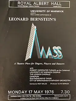 Wales received personal permission from Leonard Bernstein to give the UK Premiere of his Bernstein Mass in Coventry Theatre on 16 May[16] and the Royal Albert Hall on 17 May 1976. Performers included the City of Birmingham Symphony Orchestra, London Chorale, Cycles Dance Company, The London Chorale and University of Warwick Chorus.[17][18][19][20]
