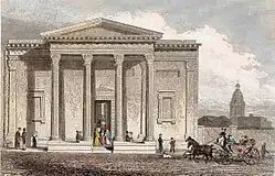 The RBSA was established as the Birmingham Society of Artists in 1821, though it can trace its origins back further to the life drawing academy opened by Samuel Lines, Moses Haughton, Vincent Barber and Charles Barber in Peck Lane (now the site of New Street Station) in 1809.[3] From this group was founded the Birmingham Academy of Arts in 1814, whose first exhibition was held that year.[4] In 1821, the Birmingham Society of Arts moved into a circular building on New Street however this was replaced by a new gallery and set of offices built behind a fine neo-classical portico in New Street by architects Thomas Rickman and Henry Hutchinson in 1829. In 1868 the RBSA received its royal charter and adopted its current name.