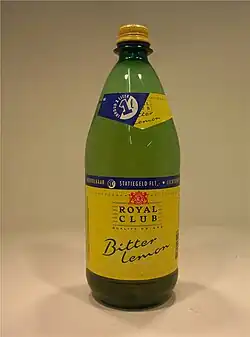 In 1969 Tims was taken over by the much larger Heineken-owned soft drink company Vrumona.[3] Vrumona soon decided to extend the Royal Club product line. In 1971 three fruit based bitter soft drinks were added to the product line. One of these flavours, Royal Club bitter lemon, proved to be a big hit while the other two (bitter orange and bitter soda) were quickly discarded. Another hugely successful soft drink launched under the Royal Club brand name was shandy (1976). This product was aimed at responsible drivers who wished to abstain from drinking beer but fancied something with a beerlike taste. At that time alcoholfree beers were hardly available in the Netherlands. In the late 1970s Royal Club Shandy was also a favourite drink among kids who were not yet allowed to drink beer. Royal Club Shandy is still being produced today, though its alcohol content (0.5%) is half of what it used to be (originally 0,9%, later 1%). In 2020 the Royal Club product line was extended with a ginger beer, that has a slightly cloudy appearance and a spicier flavour than Royal Club ginger ale.