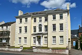 The building is of three storeys, with seven bays under a hipped roof, and was constructed "probably in the 1730s."[5] The building's façade was originally roughcast to imitate masonry and has a modillioned cornice.[6] Designed in a Carolean style, it was out of date for its time.[1]
