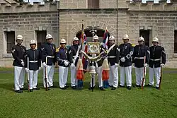 The Royal Guard's historical uniform and helmet represent the Hawaii National Guard at the National Guard Heritage Room at Joint Base Fort Myer-Henderson Hall in Virginia, and are currently the only unit in the U.S. Military authorized to wear a pith helmet.[19][24]